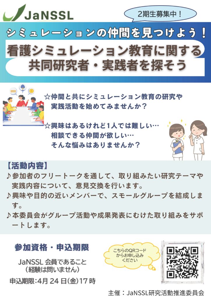 | このたび、第2期シミュレーションの仲間を見つけよう!を募集することとなりました。 これはシミュレーションの仲間を見つけ、スモールグループで研究や実践を進めていくプロジェクトです。 第1期では2グループのメンバーが活動し、学術集会において交流集会や研究発表、論文投稿を行っていました。 ぜひ、ご参加ください! 研究活動推進委員会より ☆ 詳細は、下記をご参照ください。 ☆ 申し込みは、下部にあるQRコードまたはこちらからどうぞ。 |