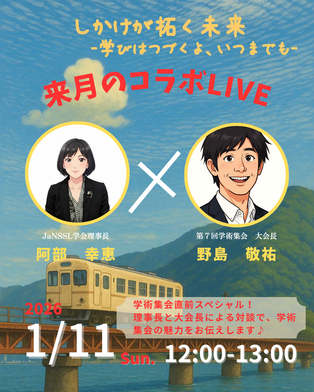 インスタライブを開催します。今回は、学術集会直前スペシャルとして阿部理事長×野島大会長コラボLIVEです。